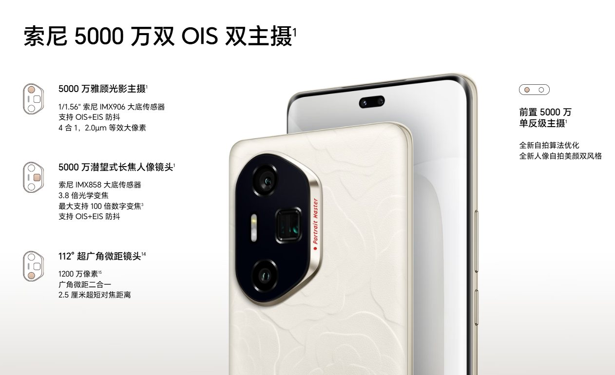カメラ構成は「5,000万画素、IMX906のメインカメラ」「1,200万画素の超広角/マクロ兼用カメラ」「5,000万画素のペリスコープ望遠カメラ」というものになっています。真ん中の四角いのがおそらくペリスコープでしょう。