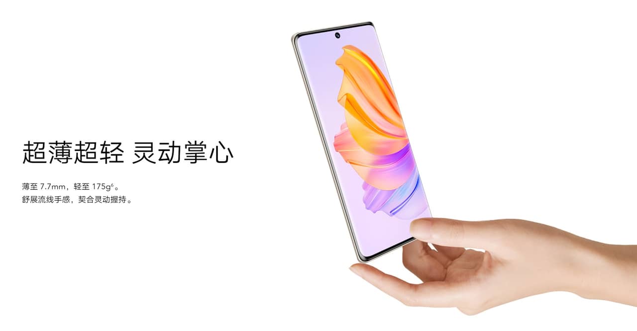 ▼HONOR 80 SEは6.67インチで大きめなスマホではありつつも、厚みは7.7mm、重さは175gと比較的軽量・薄型にシェイプアップされているのが特色!曲面形状も相まってなかなか持ちやすそう。↓