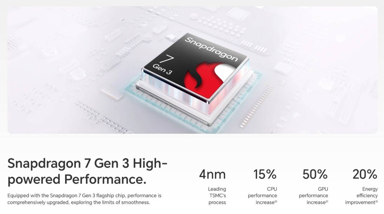 ▼SoCはミドルハイのSnapdragon 7 Gen 3で、ハイエンドほどのスペックではないものの十分に高スペック!ゲームは画質設定次第で快適に遊べるので、こだわらない方にとっても選択肢となるでしょう。↓