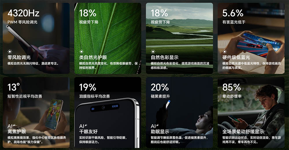 ▼18%の視覚疲労の軽減、メラトニン分泌を20%加速させる睡眠補助、85%の乗り物酔い軽減、など眼に優しいディスプレイだそう。↓