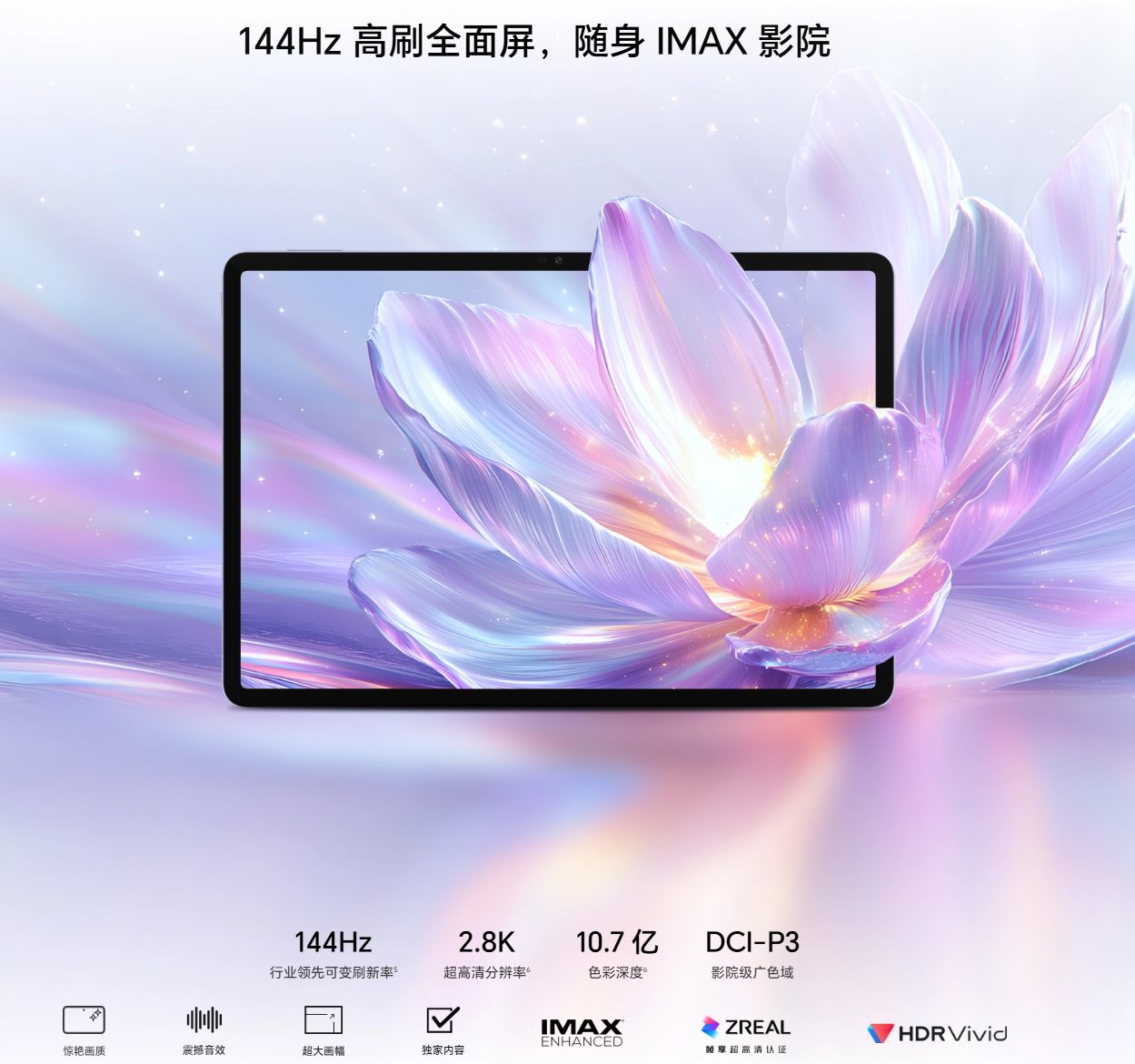 HONOR Pad V9のディスプレイはサイズが11.5インチと大きめ!加えて解像度も高く、色表示の対応数も10.7億色、そして最大144Hzリフレッシュレート対応と非常に優秀なスペックです。
