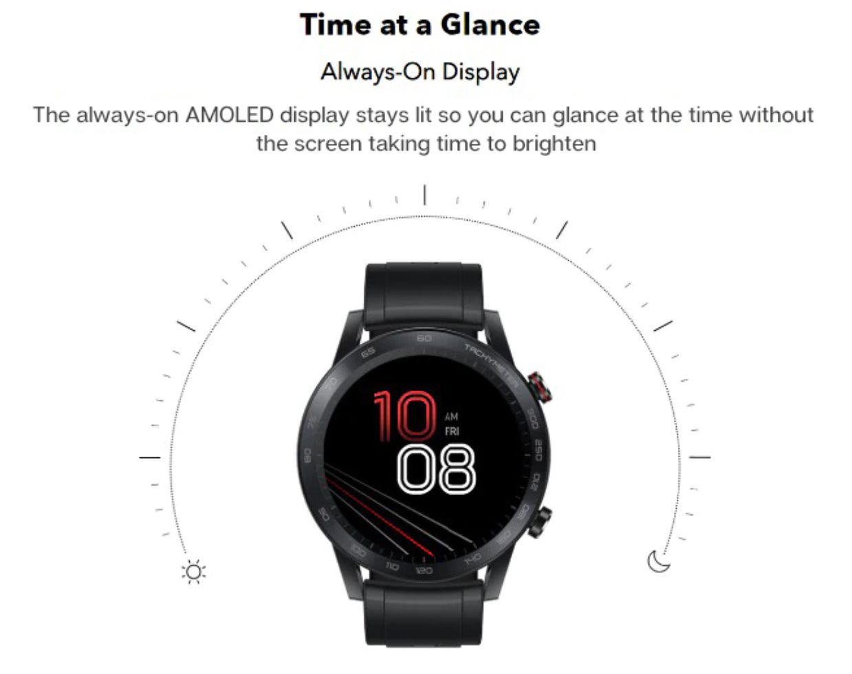 ▼HONOR Magic Watch 2は視認性の良い有機ELを採用しています!加えて常時表示もでき、腕を上げずにチラ見する程度でも時刻がわかるのでホンモノの腕時計らしい使い方ができるのです。大きさは42ミリは1.2インチ、46ミリは1.39インチです。↓
