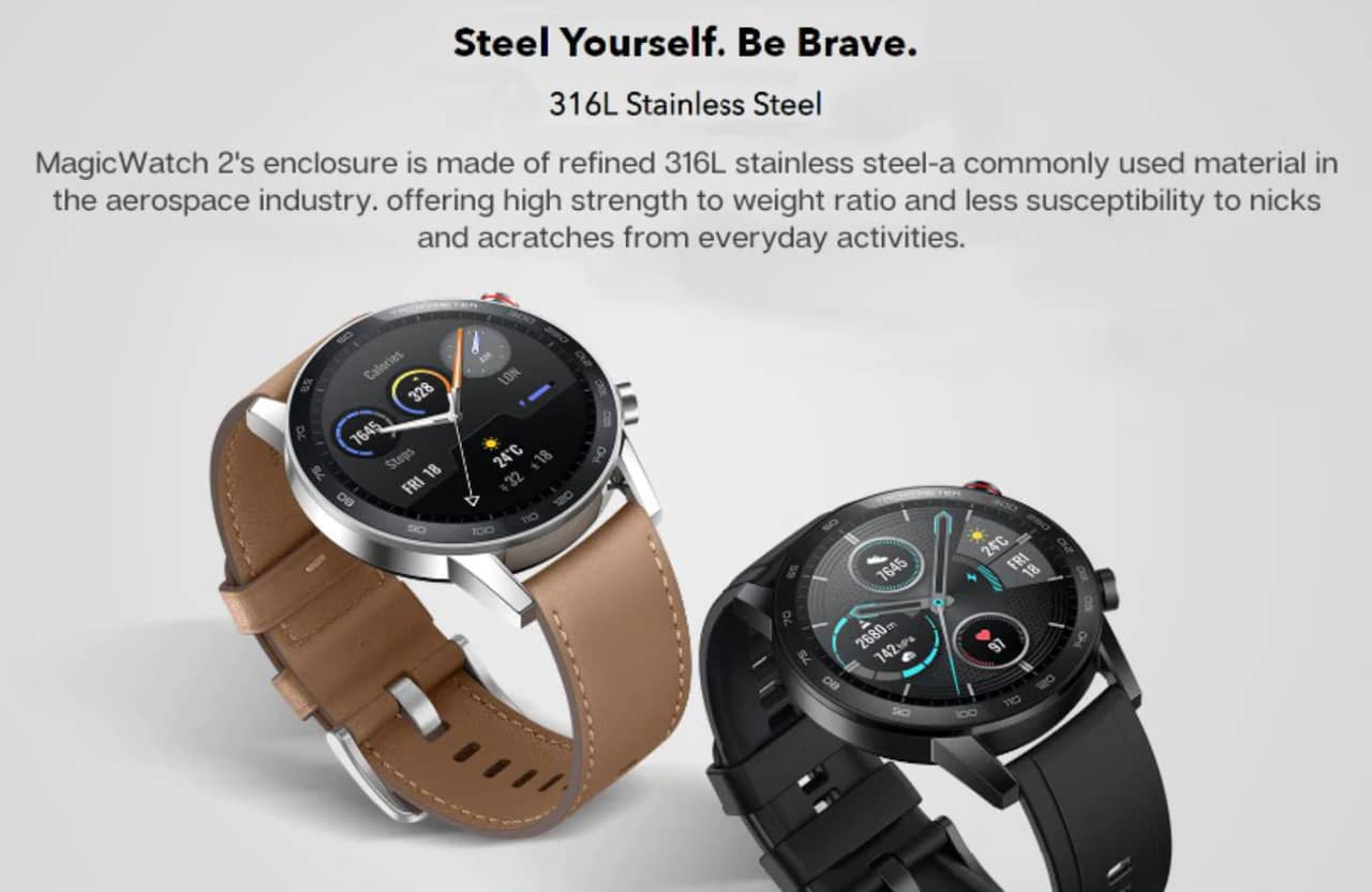 ▼HONOR Magic Watch 2は高級感あるルックスとなっています!ステンレス製のボディで、シックな感じが大人らしさを感じさせます。カラーはブラックとブラウンの2つ。42mm版と46mm版の2つの大きさが用意されています。↓