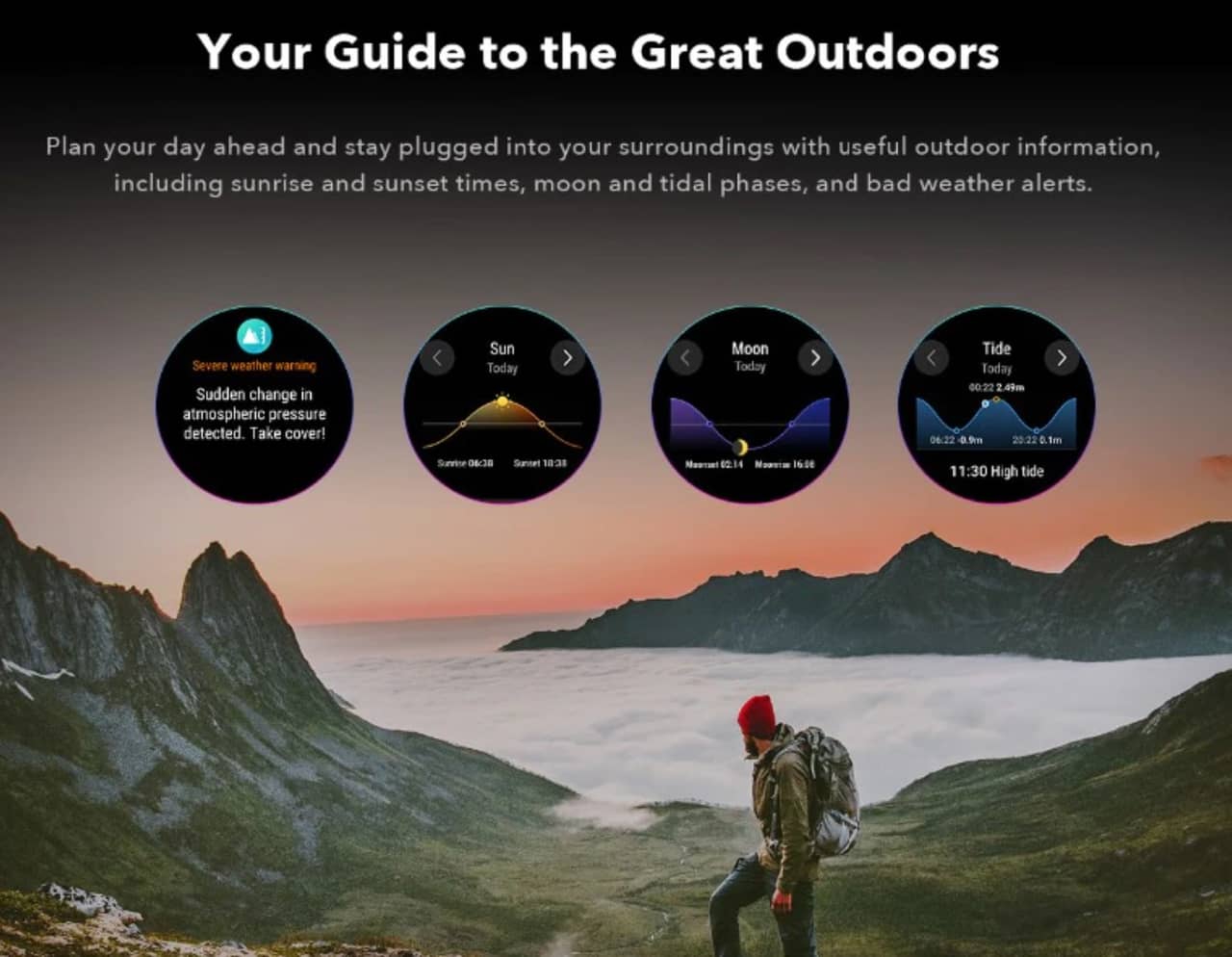 ▼GPSのルートトラッキング機能以外にも、アウトドア向けの各種機能が内蔵されています。日の出・日没の時間や悪天候を知らせる機能も対応!↓