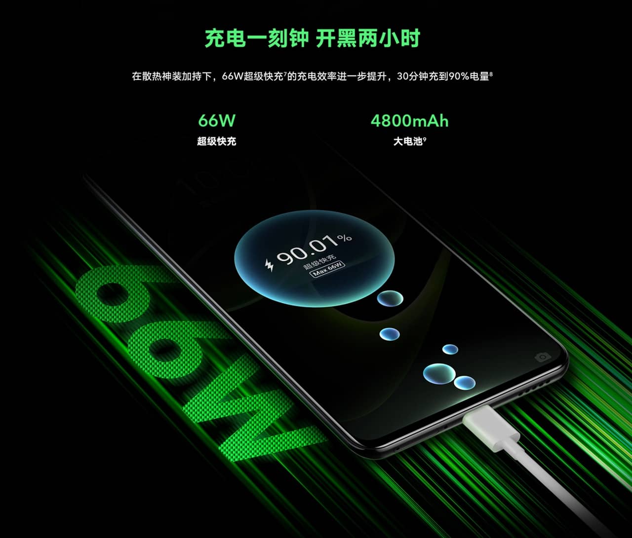 ▼バッテリー容量は4,800mAhと大きく、さらに急速充電66Wに対応とこの部分はかなりハイスペックです。30分で90%とほぼ満充電できる速さは素晴らしい!↓