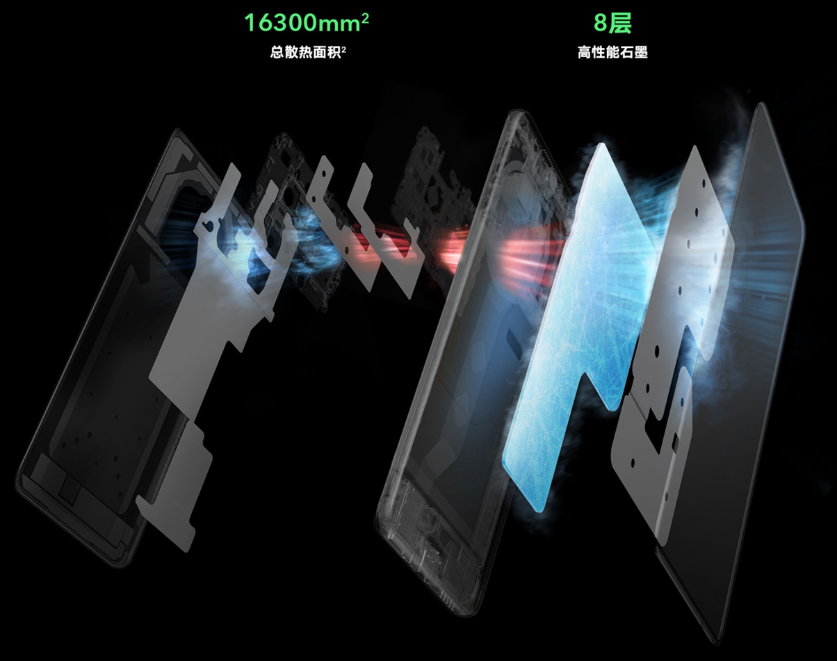 ▼またSnapdragon 888は発熱しやすいSoCですが、それの対策として冷却システムもバッチリ組み込んでいます。広い面積の冷却板と、8層の放熱設計で組み上げており、実際ゲームしてどれほど安定するか興味深い(`・ω・´)。↓