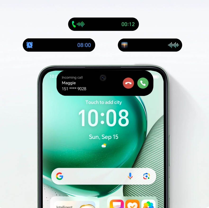 ▼本機の独自機能として、フロントカメラ部分に「マジックカプセル」という黒い楕円型の表示領域が搭載されています。通話や録音、音楽再生中に表示され、それらを操作、管理することができます。ダイナミックな機能ですね。↓
