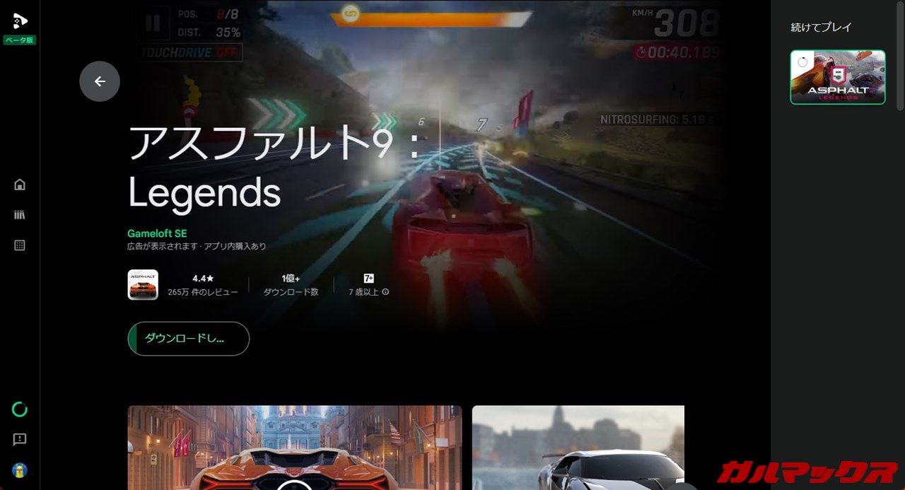 普段遊んでいるウマ娘とかAsphalt 9とか、そういうゲームがパソコンモニター…つまりスマホよりもデカい画面で実際に遊べるっちゅうわけです。