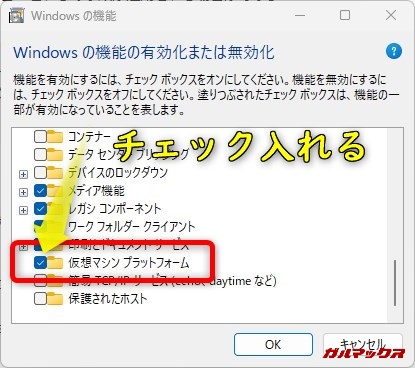 ▼そうするとWindowsの機能って窓がでてくるんで、下にスクロールし「仮想マシン プラットフォーム」の部分にチェックを入れて、OKを押せば完了です。↓