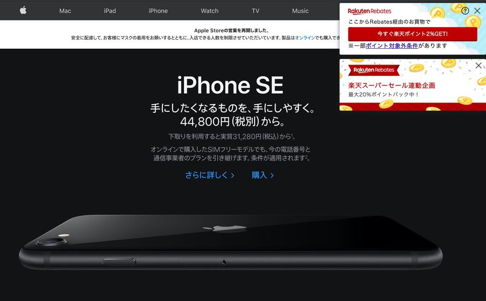 例えばAppleのオンラインストアでiPhone SEを買うとします。Appleは楽天リーベイツに登録があるので楽天リーベイツにアクセスしてから買うだけで楽天ポイント還元。大体いつも1%還元は実施されてます。やらないと損ですよ。