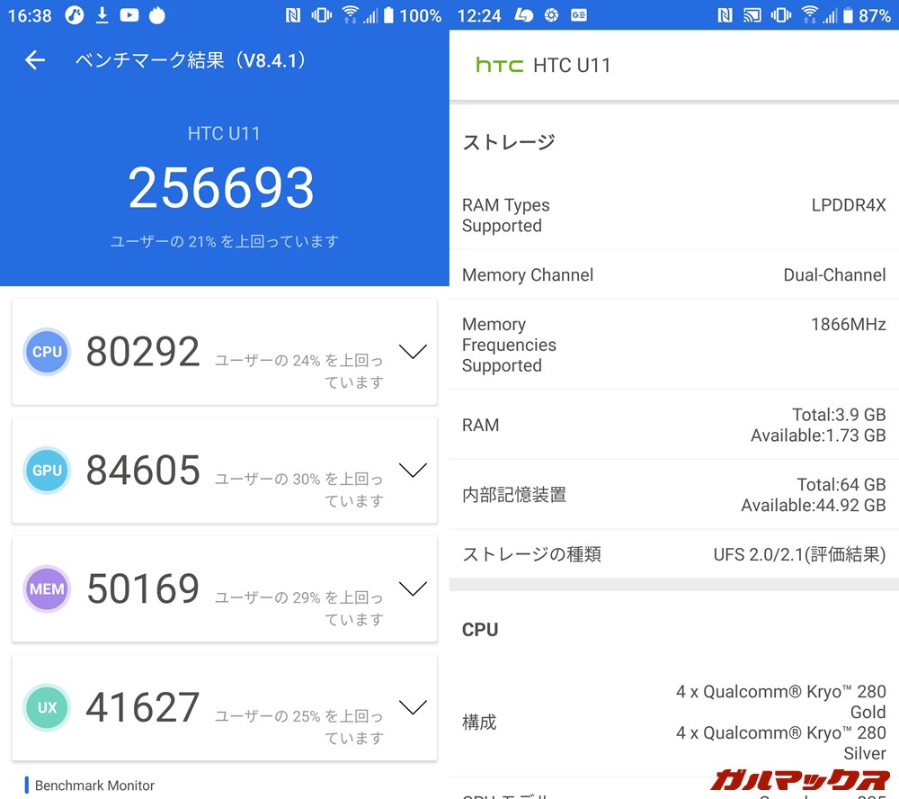 ▼以下のHTC U11-HTV33(au版)2台目の実機AnTuTuベンチマークスコアはガルマックスを御覧頂いた読者様からのご投稿!複数のスコアが集まり平均スコアの精度も高くなりました!ご投稿ありがとうございます!