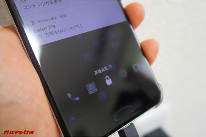 ▼HTC U11はQualcommのQuickChage3.0に対応しており、急速充電中は画面に”高速充電”と表示される。↓