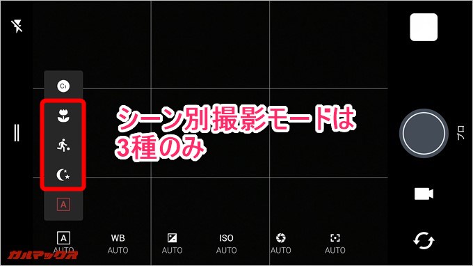一応、プロモード(マニュアルモード)で「夜(夜間の撮影モード)」「スポーツ(動きの早い被写体に対しての撮影モード)」「接写(被写体に近づいて撮影するモード)」が備わっている程度。プロモードでのモード変更時も各種設定はオートに設定出来るので、実質的なシーン別撮影モードはこの3つ。