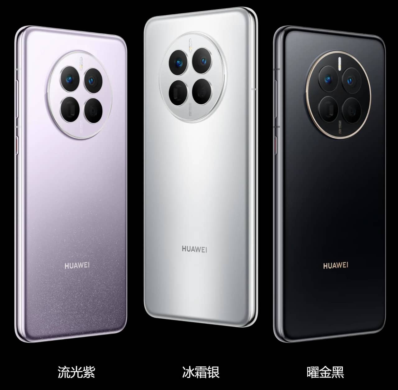 ▼Mate 50Eのカラーはパープル、シルバー、ブラックの構成となっています!円形カメラデザインが特徴的で、特にブラックはゴールドっぽいアクセントもあり上品なスタイル。↓