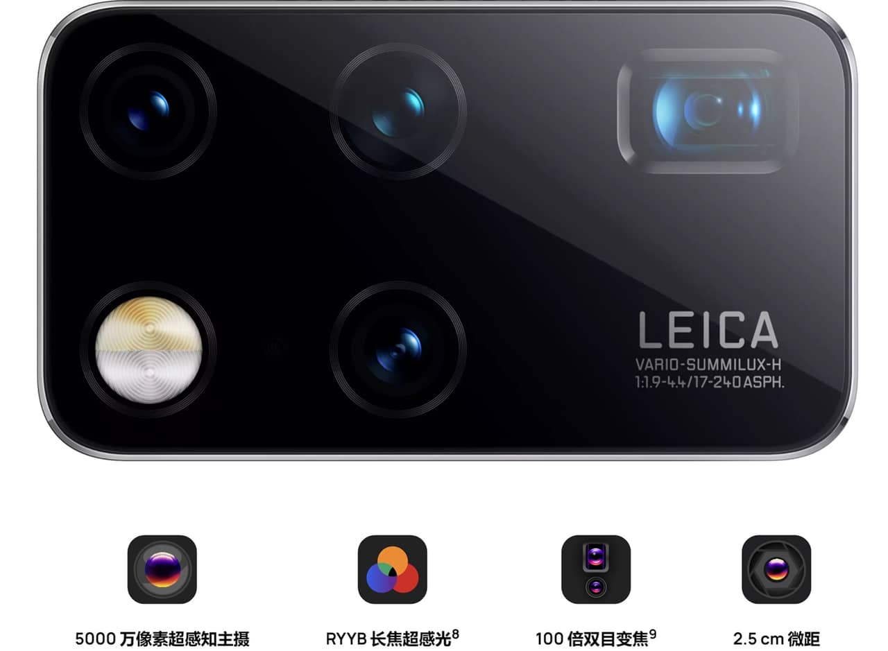 ▼カメラは「5,000万画素のメイン」「1,600万画素の超広角カメラ」「1,300万画素の望遠カメラ」「800万画素の望遠カメラ」という組み合わせ。さらに、老舗のカメラブランドであるLEICAの監修を受けているため、その品質の高さに期待です!↓