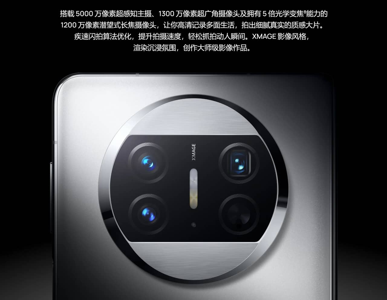 HUAWEI Mate X3の背面カメラは広角のメインカメラ(5,000万画素)、ワイド画角の超広角カメラ(1,300万画素)、光学ズーム対応の望遠カメラ(1,200万画素)の3眼構成です。
