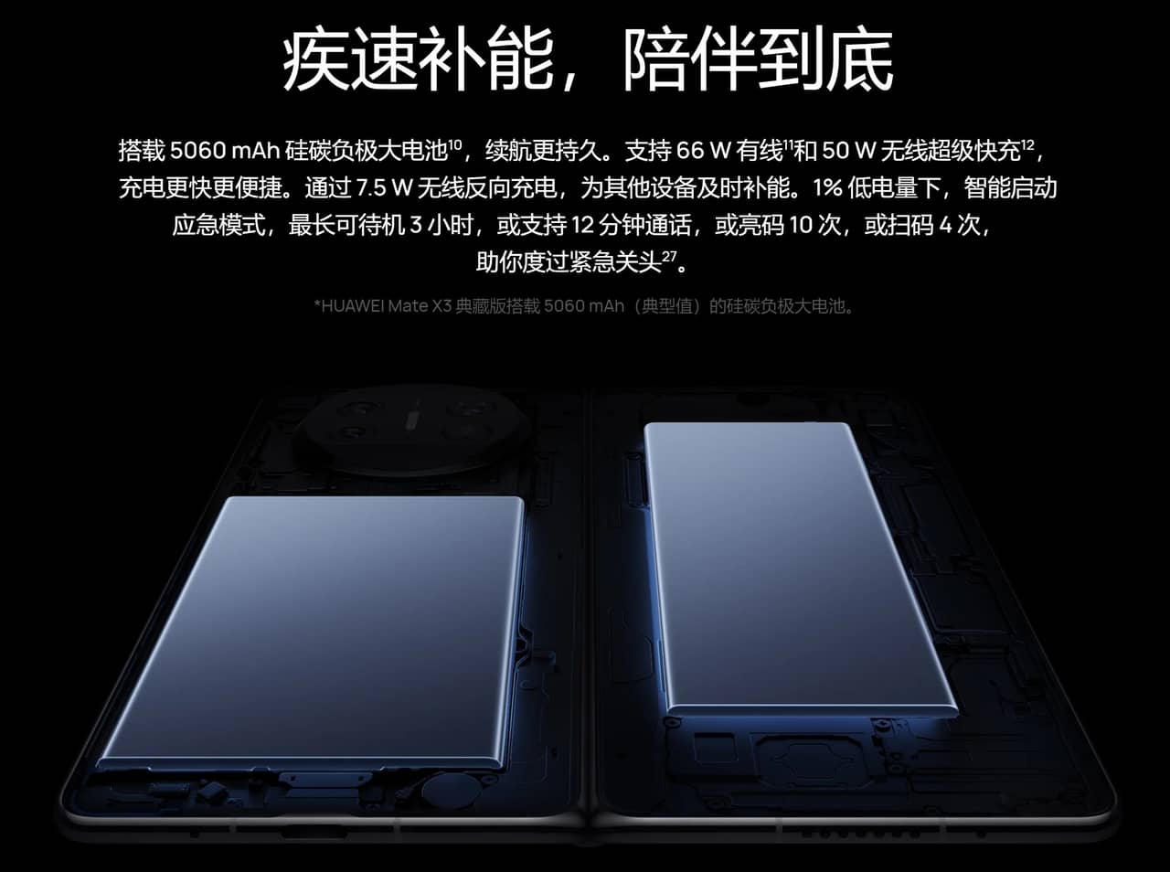 ▼Mate X3のバッテリー容量は2通りあって、256GB/512GB版は4,800mAh、1TB版のコレクターズ・エディションが5,060mAhとなっています。↓
