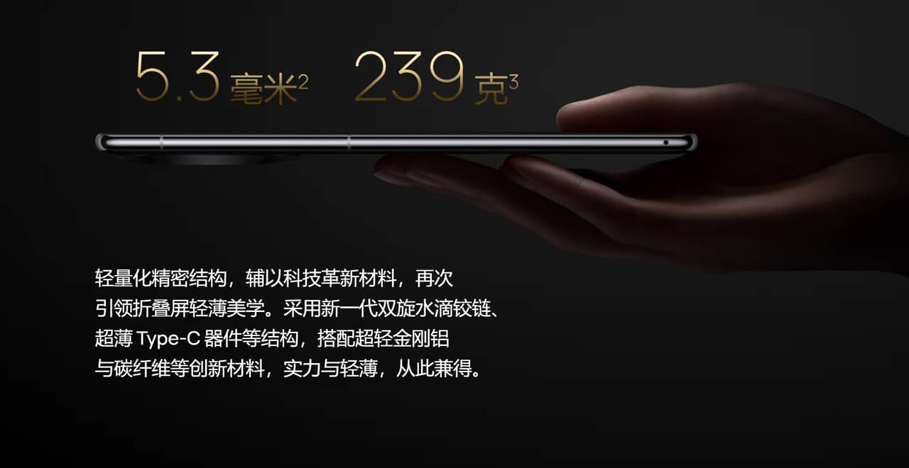 ▼Mate X3はこの手のフォルダブル(ヨコ折り式スマホ)としてはかなり軽量で薄型なのが特徴!厚みは折り畳むと11.08mm、開くと5.3mmまで薄くなります。重さも239gと見た目よりは軽い印象。↓