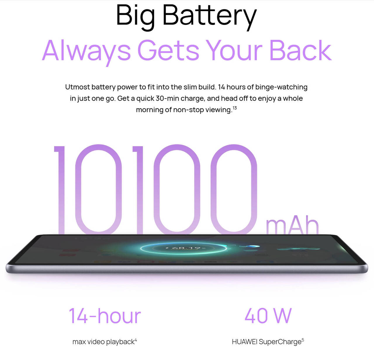 ▼バッテリー容量は10100mAh。14時間の連続動画視聴が可能とのこと。40W(SuperCharge)の急速充電に対応しています。↓