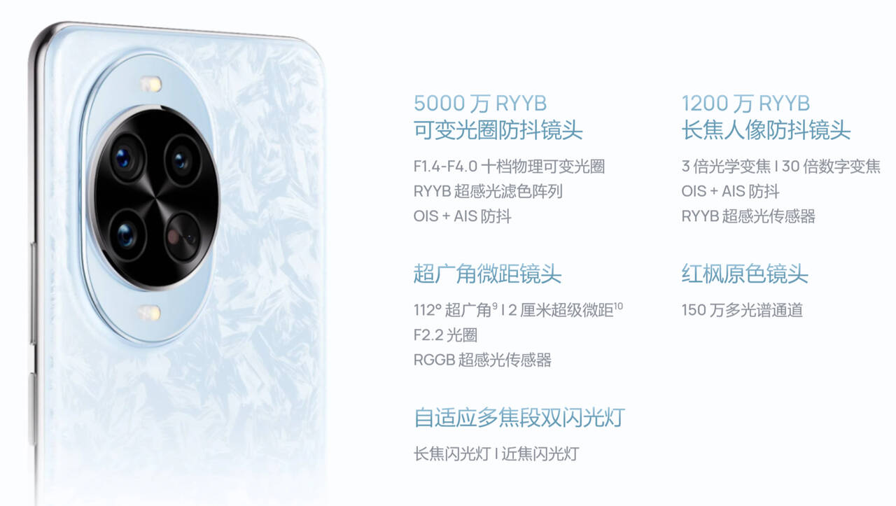 ▼カラーは冰晶蓝(ブルー)冰晶粉(ピンク)、凝霜白(ホワイト)、羽砂黑(ブラック)の4色。背面の加工が涼しさを感じさせます。カメラバンプの上下にフラッシュライトがついている珍しいデザインです。↓