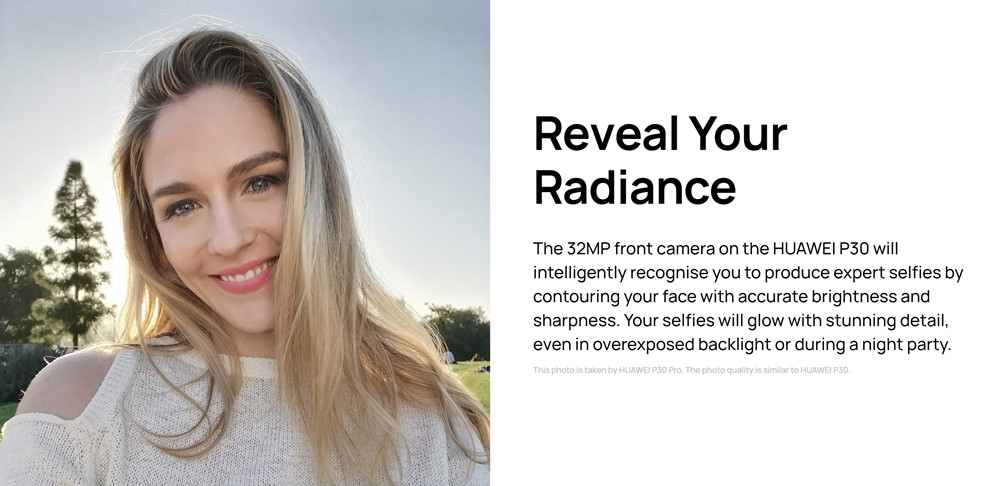 ▼HUAWEI P30はインカメラも高精細センサーを搭載。3200万画素カメラでインカメラもメインカメラ並の精細さで自撮りを楽しめます。もちろん、美肌、小顔、肌色なんかのカスタマイズも柔軟に対応。↓