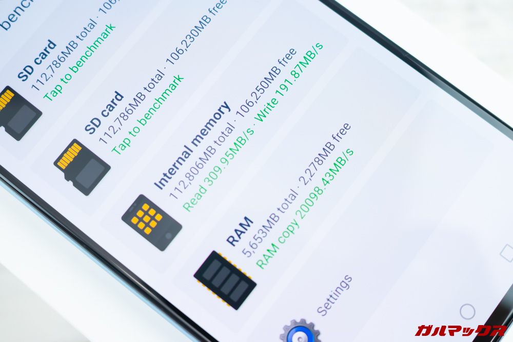 ▼HUAWEI P30のストレージ速度はReadが309.95MB/s、Writeが191.87MB/s。特別速度が速いって訳ではありませんが、不満が出る事が少ない範囲。↓