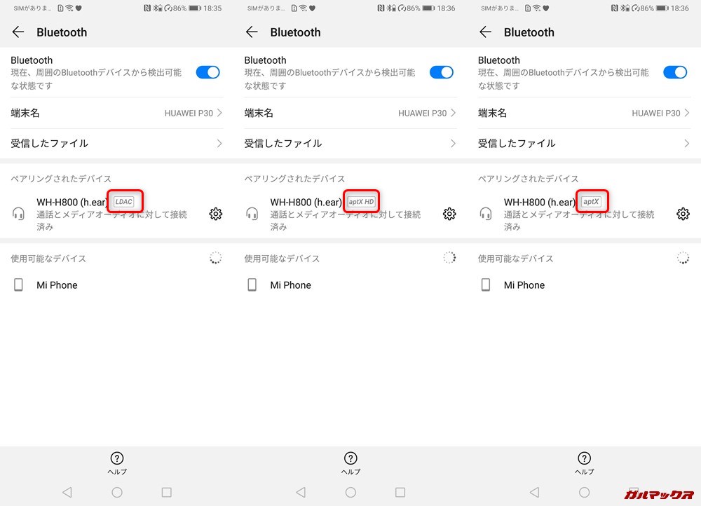 ▼ガルマックスのテスト環境で、「Bluetooth設定画面で接続コーデックが確認できるもの」はapt-X、apt-X HD、LDAC。↓