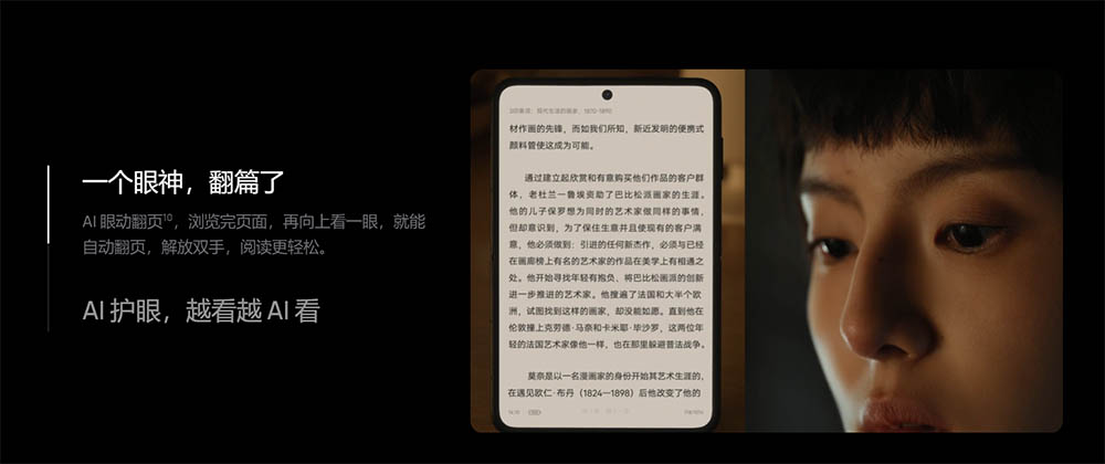 ▼読書時に、見上げることで自動でページをめくってくれる機能。長時間読書しても指が疲れないのはめちゃ便利じゃない??AIによる明るさ調整機能なども搭載、眼が疲れにくくなります。↓