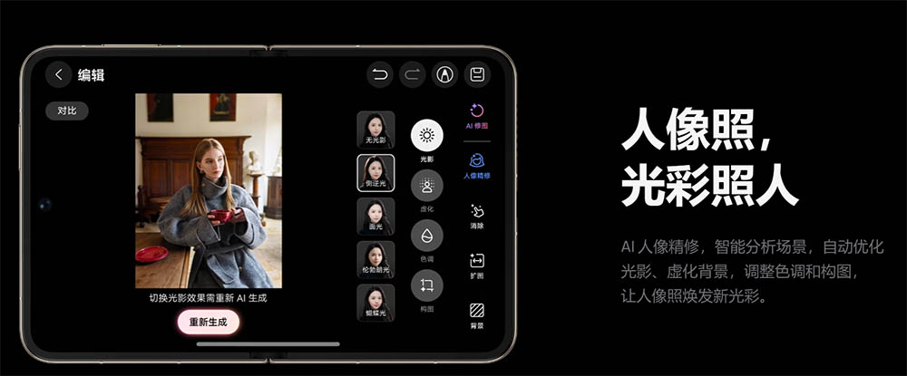 ▼AIによるポートレートの修正。シーン分析、光と影、ボケの調整などを行えます。↓