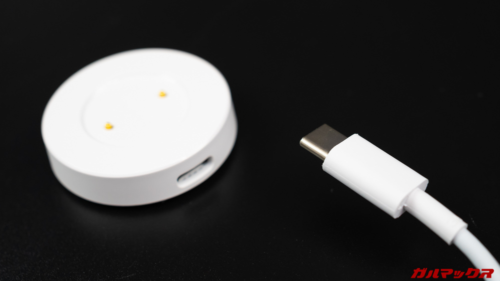 多くのスマートウォッチでは「独自形状の充電台にケーブルが直結されている」という充電台も多く、実際に僕もそのような製品を利用していた時にケーブルが断線してしまい、専用の充電ケーブルは取り寄せ注文しか出来ず困った、という経験があります。充電台とケーブルのセパレート式は他のメーカーさんも積極的に取り入れて欲しいと感じるポイントですね。