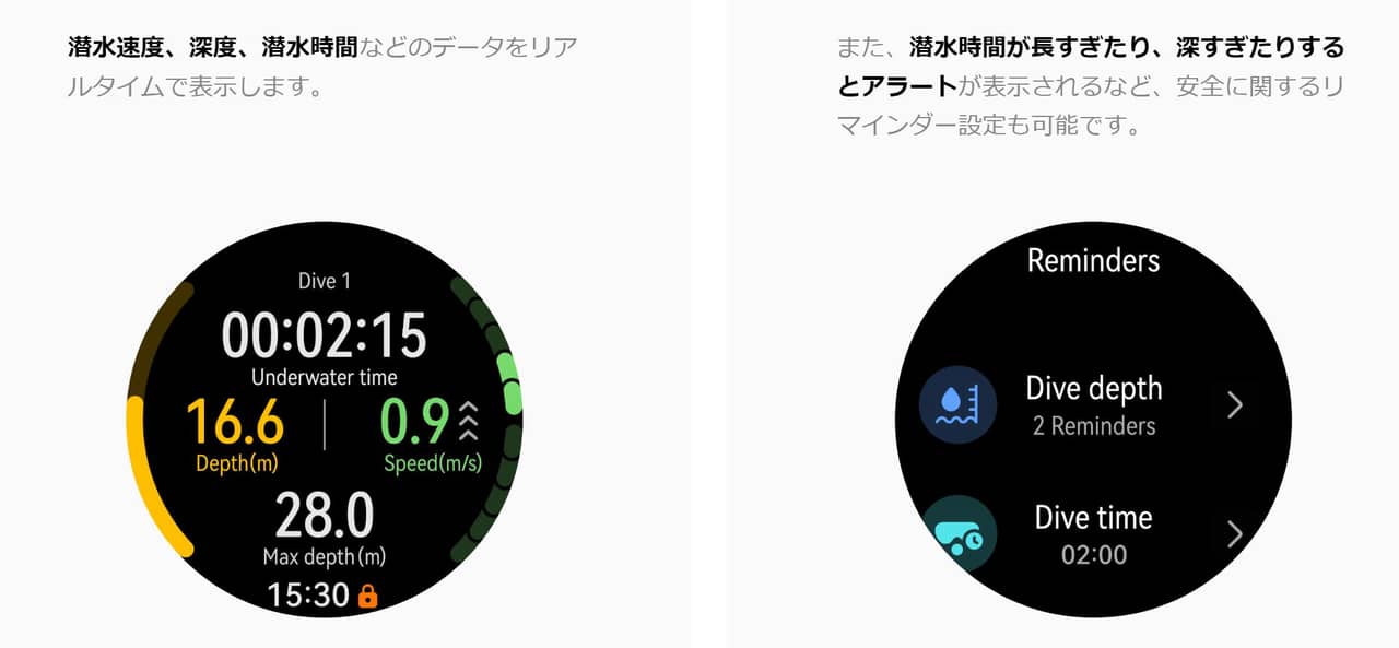 ▼5ATM防水を生かしており潜水の測定もできるそうです!また潜水時間や深さをリマインドする機能も搭載されており安全面もサポートしてくれます。↓