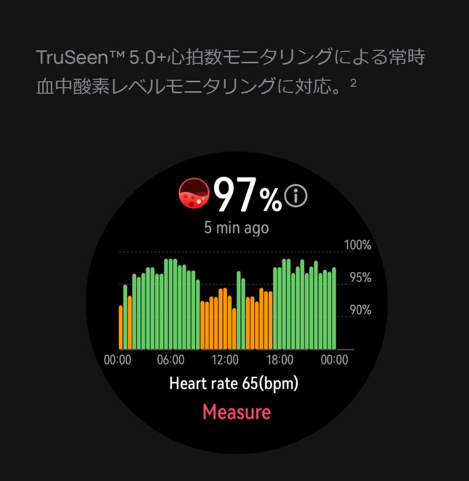 当然ながら血中酸素濃度測定に対応。さらに定期測定もでき、一日の血中酸素濃度の推移を見られるのも嬉しいですね(`・ω・´)。