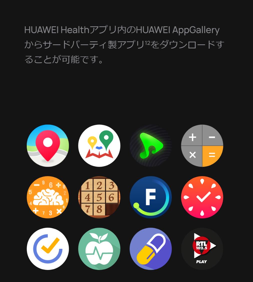 ▼HUAWEIのアプリストアであるHUAWEI AppGalleryからは様々なサードパーティアプリをダウンロードして導入できるとのこと!運動、健康のモニタリングや電卓にちょっとしたパズルゲームといろいろできそうです。↓