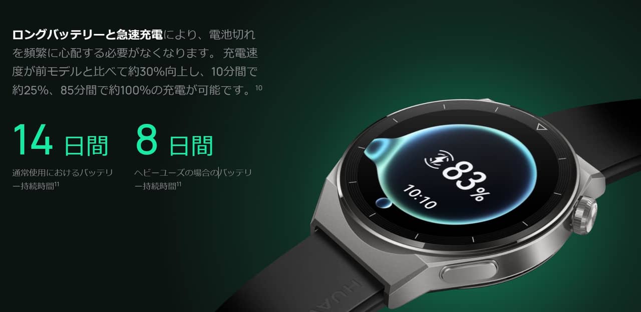 ▼電池持ちも優秀で通常使用で2週間、ヘビーに使っても8日ももつそうです!また充電速度もアップしており、85分で満充電できるとのこと!↓