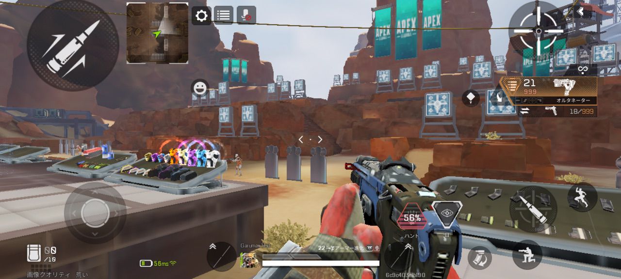 ▼メインで遊んでいるApex Legends Mobileでは画質「荒い」+フレームレート「高」の最もFPSが出やすい設定にしても射撃訓練上ですらカクつくレベル。これじゃあまともに遊べませんね。↓