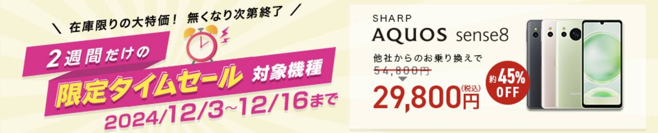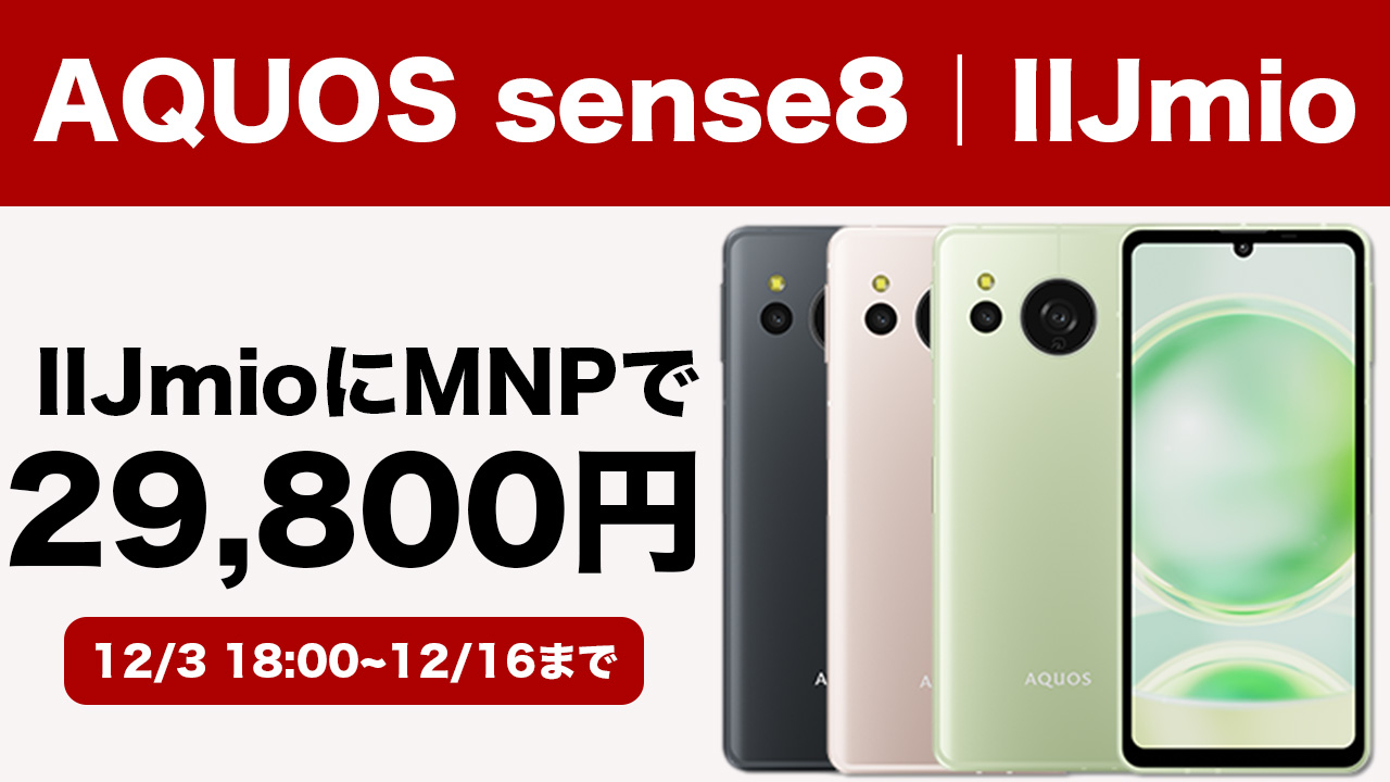 12/16まで!IIJmioでAQUOS sense8がMNPで54,800円→29,800円
