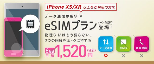 7/18から契約できるeSIMプランは1種類で、月あたりの通信容量は6GB、料金は税抜き1520円という内容です。テザリングには対応していますが、同社の他のプランのようにSIMカードを追加して通信容量をシェアすることはできません。