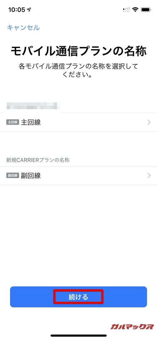 ▼コードを読み取るとモバイル通信プランの名称画面が表示されるので「続ける」をタップ。この時注意書きのポップアップが出るのでOKを押しましょう。↓