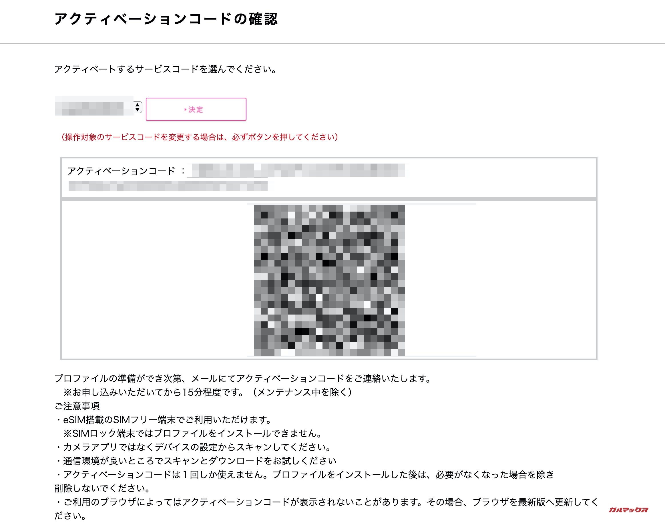 ▼契約後に登録アドレスに届くアクティベーションコードへのリンクをクリック。アクティベートするサービスを選択して「決定」を押すと以下のようにアクティベーションコードとQRコードが表示されます。↓