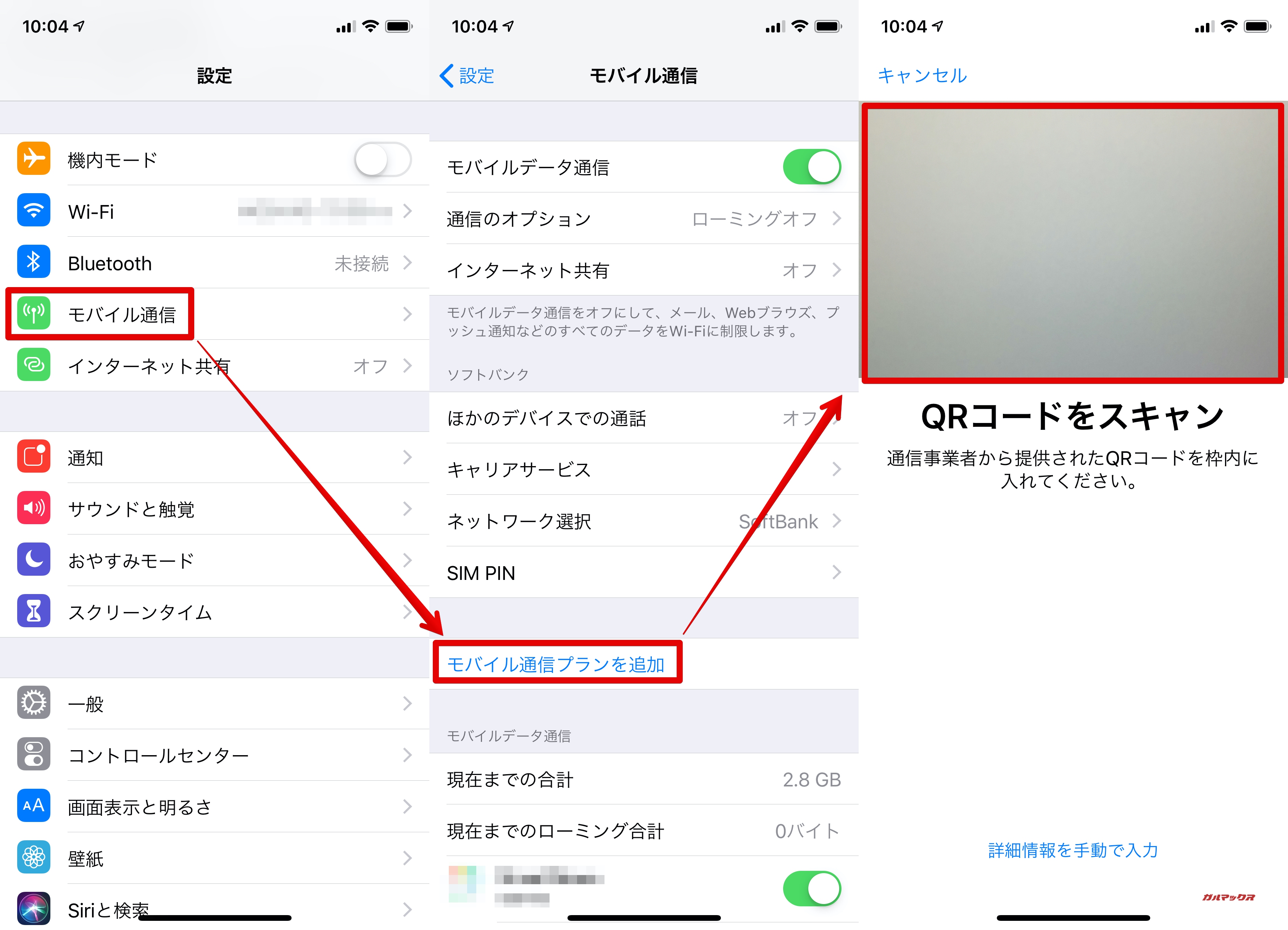 ▼設定→モバイル通信→モバイル通信プランを追加をタップすることでコードの読み取り画面に進みます。あとはQRコードを読み取るだけ。↓