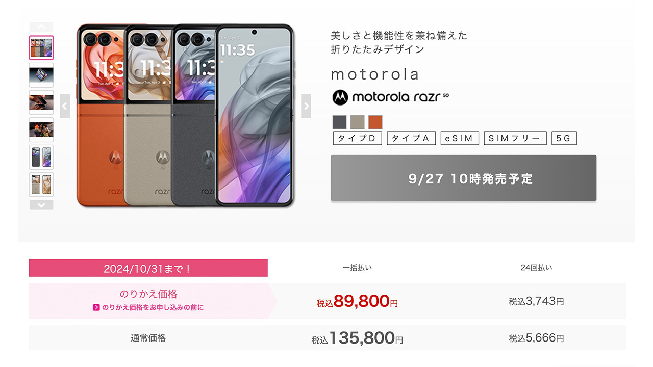 モトローラが日本へ投入した最新型の縦折りスマートフォン「motorola razr 50」は2024年9月27日発売ですが、さっそく我らがIIJmioが意味不明なくらい割引してます。IIJmioでは2024年9月27日10時より申し込みスタートです。