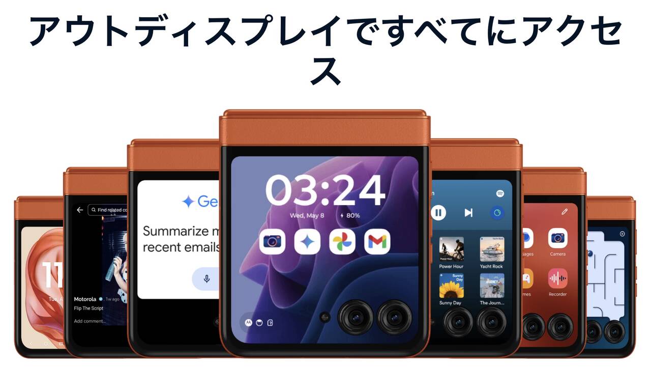 小型のサブディスプレイも時刻の確認や通知有無のチェック、着信確認などは出来ましたが、閉じた状態でできることは非常に限定的でした。一方でmotorola razr 50は流行りの大型サブディスプレイを備えることで閉じたまま快適にできることが格段に増えてます。また背面のディスプレイでGeminiを使えるのは初とのこと。