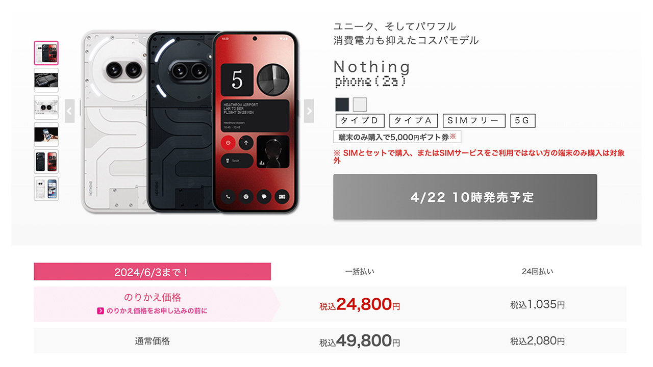 IIJmioでNothing Phone (2a)の販売が2024年4月22日10時よりしました。通常価格は49,800円ですが、MNPの場合は24,800円で手に入ります。正直、この仕様なら凄くコスパ良いですね。