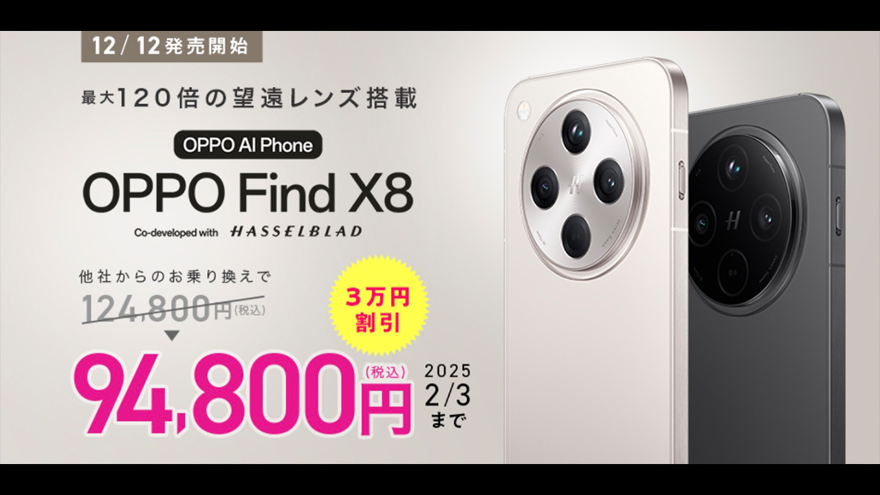 最大120倍望遠!IIJmioでOPPO Find X8が初売り!MNPで3万円オフ