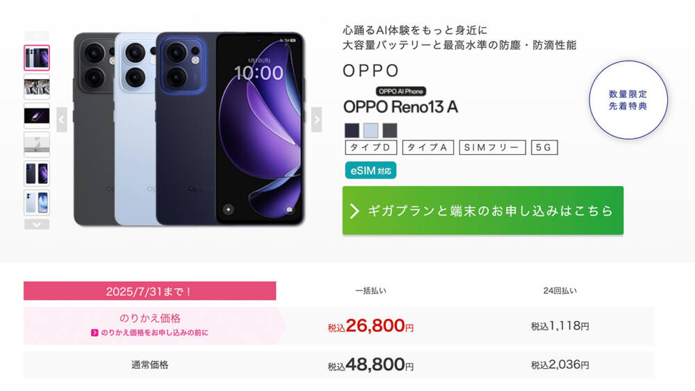 IIJmioでOPPO Reno 13 Aが販売スタート!MNPは26,800円、2,980円のイヤホン付き