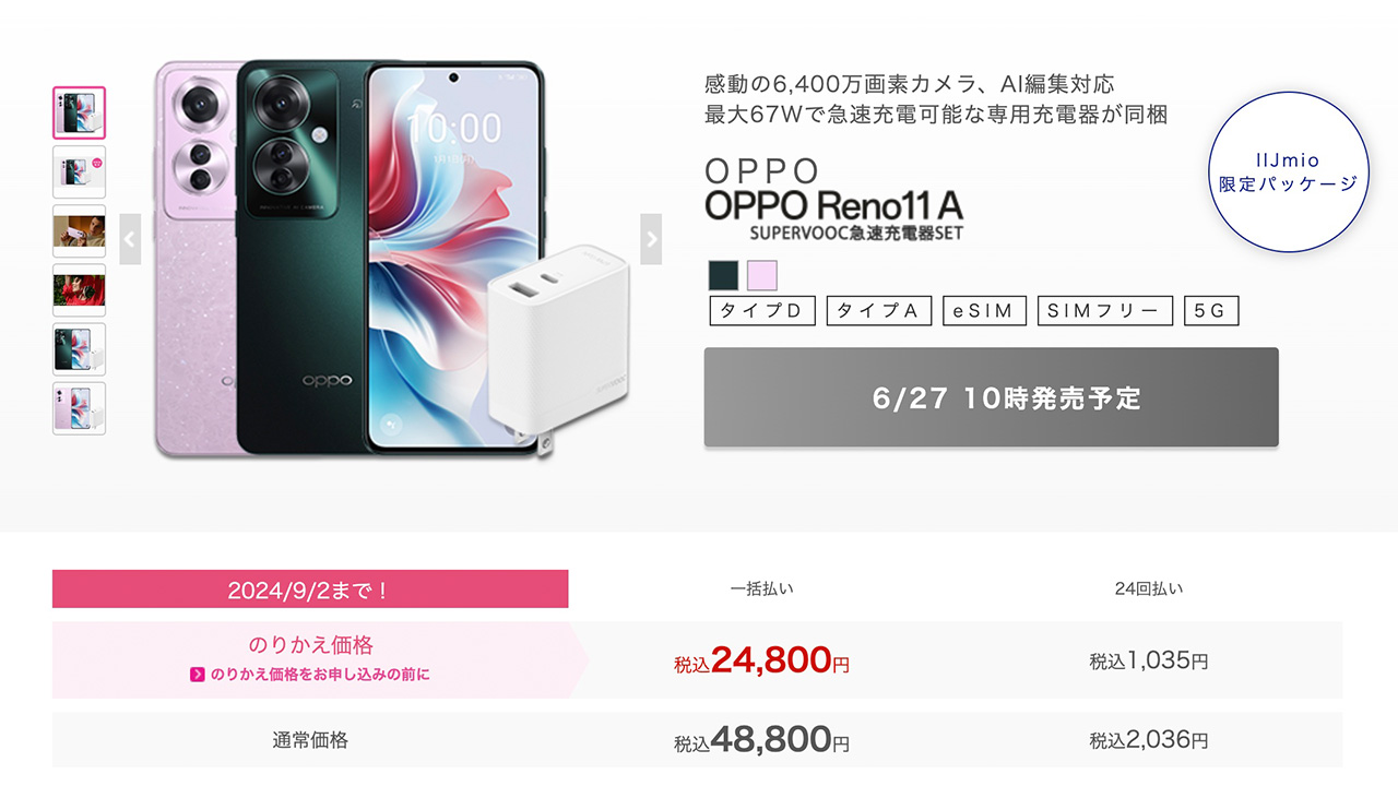 IIJmioでOPPO Reno11 Aは6月27日10時から販売開始!