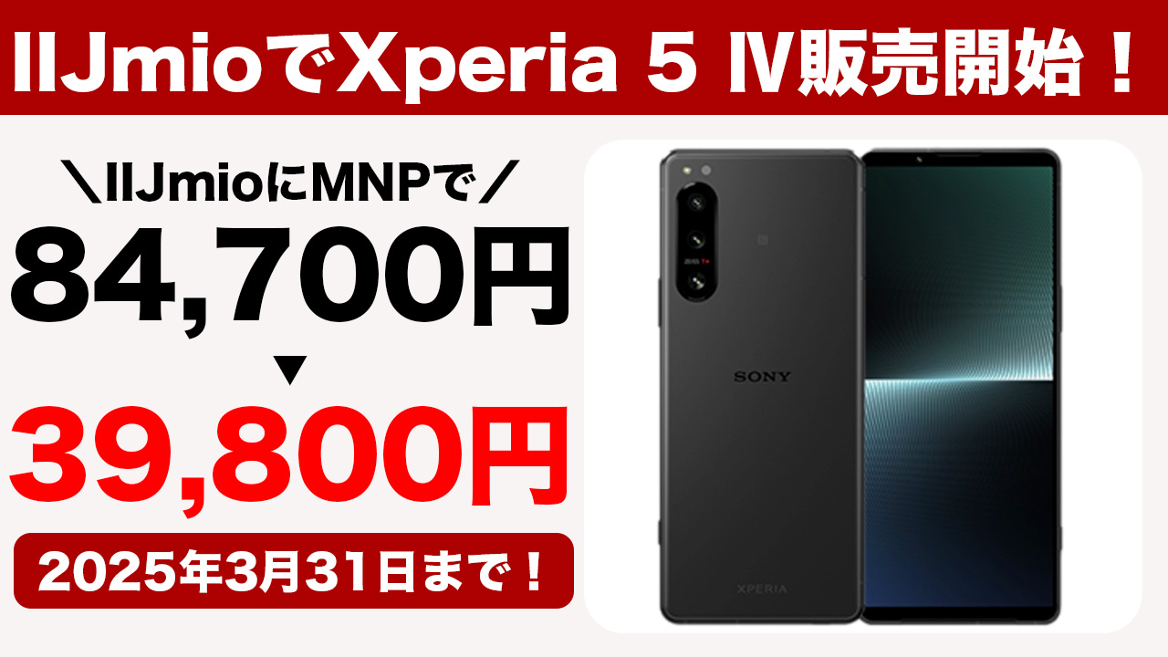 Xperia 5 Ⅳはもともと119,900円でしたが、執筆時点でソニー公式サイトでは84,700円。IIJmioでの通常価格も同じなので普通に買うなら特に旨味なしですが、MNP(他社からの乗り換え)だと半額以下の39,800円で手に入ります…!