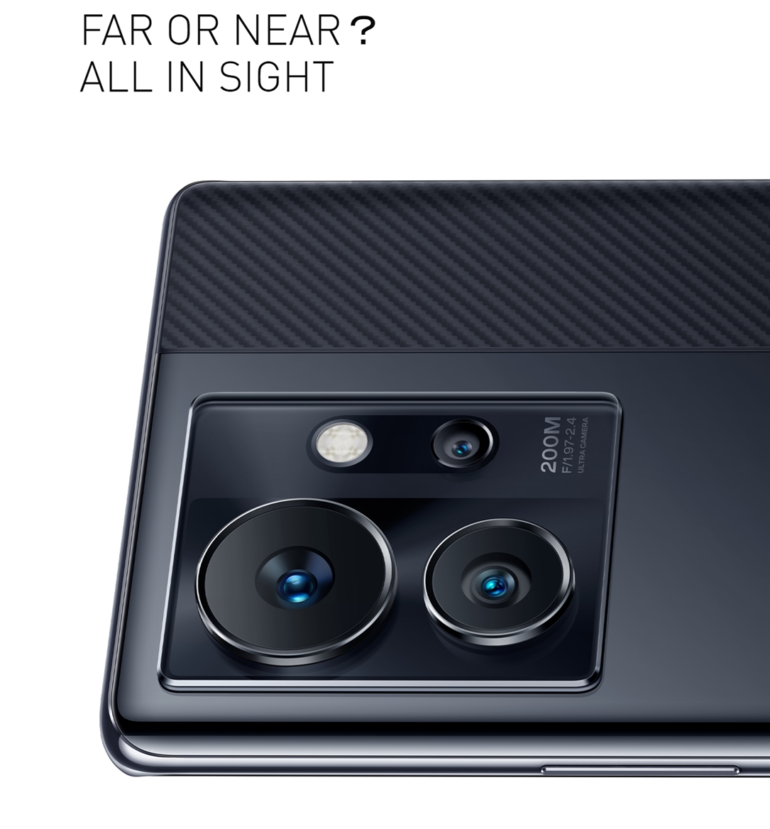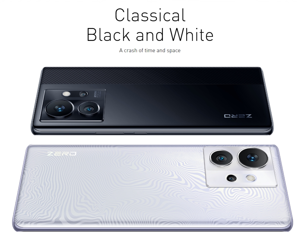 ▼Infinix Zero Ultraのデザイン、実にカッコいい!ブラックはカーボン模様があしらわれ、ホワイトはなめらかなウェーブ模様が入っており、どちらも非常に高級感ある見た目だ!カラーはブラックとホワイトの2色構成でエレガントなチョイス。↓