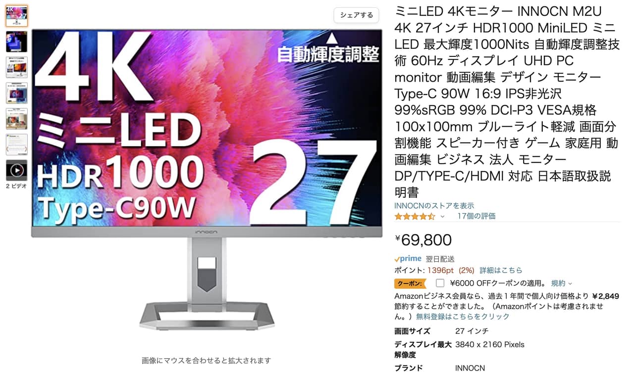 これまで「27インチ」「4K」「MiniLED」が揃う製品は俺の記憶が正しければ20万円くらいしたんだが…Innocn M2Uは6万円ちょいくらいで買えてしまう。正直、「大丈夫かよ」と勘ぐる価格なのである。