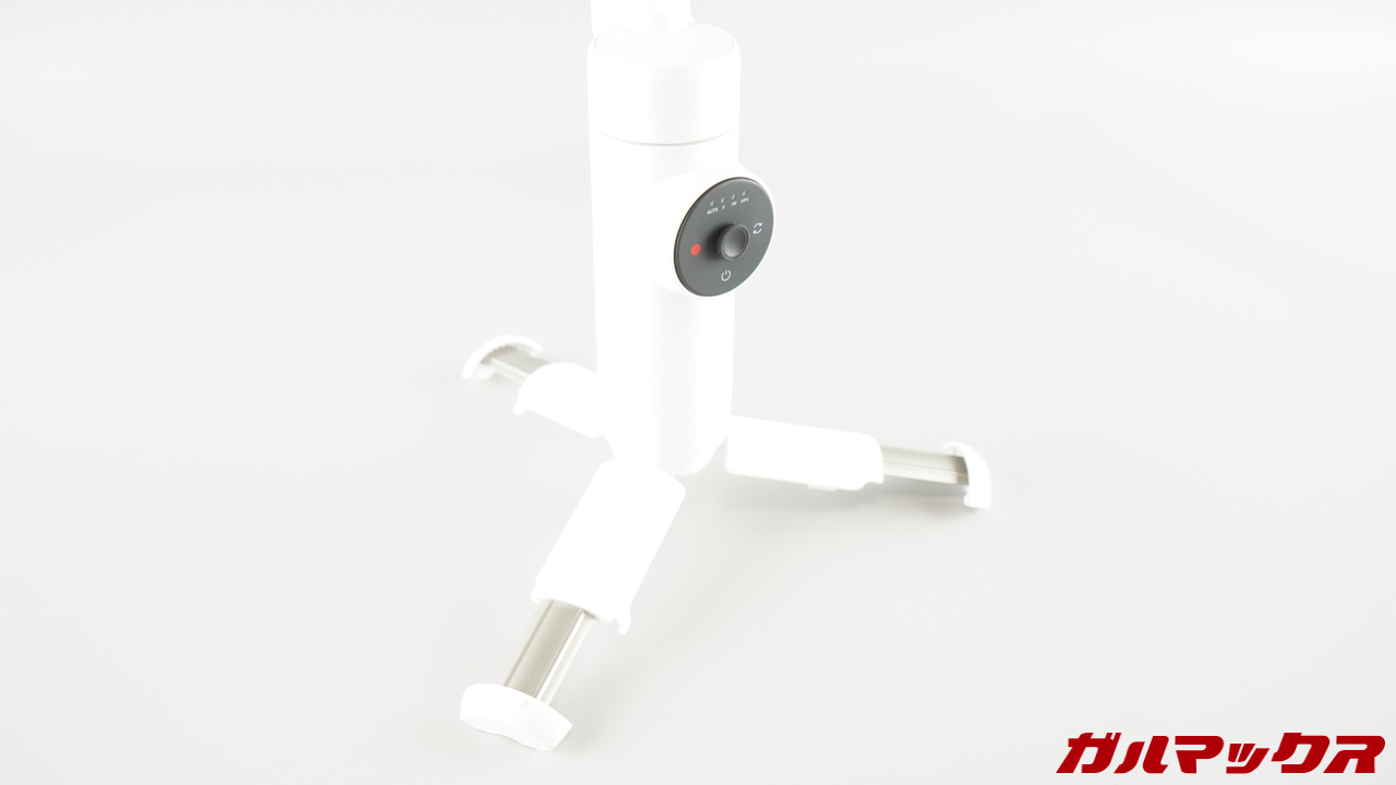 ▼下部にはグリップ延長兼三脚が内蔵されている。三脚は割と大型でクッション性もあり安定しているが、屋外で風が吹いている状況だと煽られて倒れることがあるので注意せよ。↓